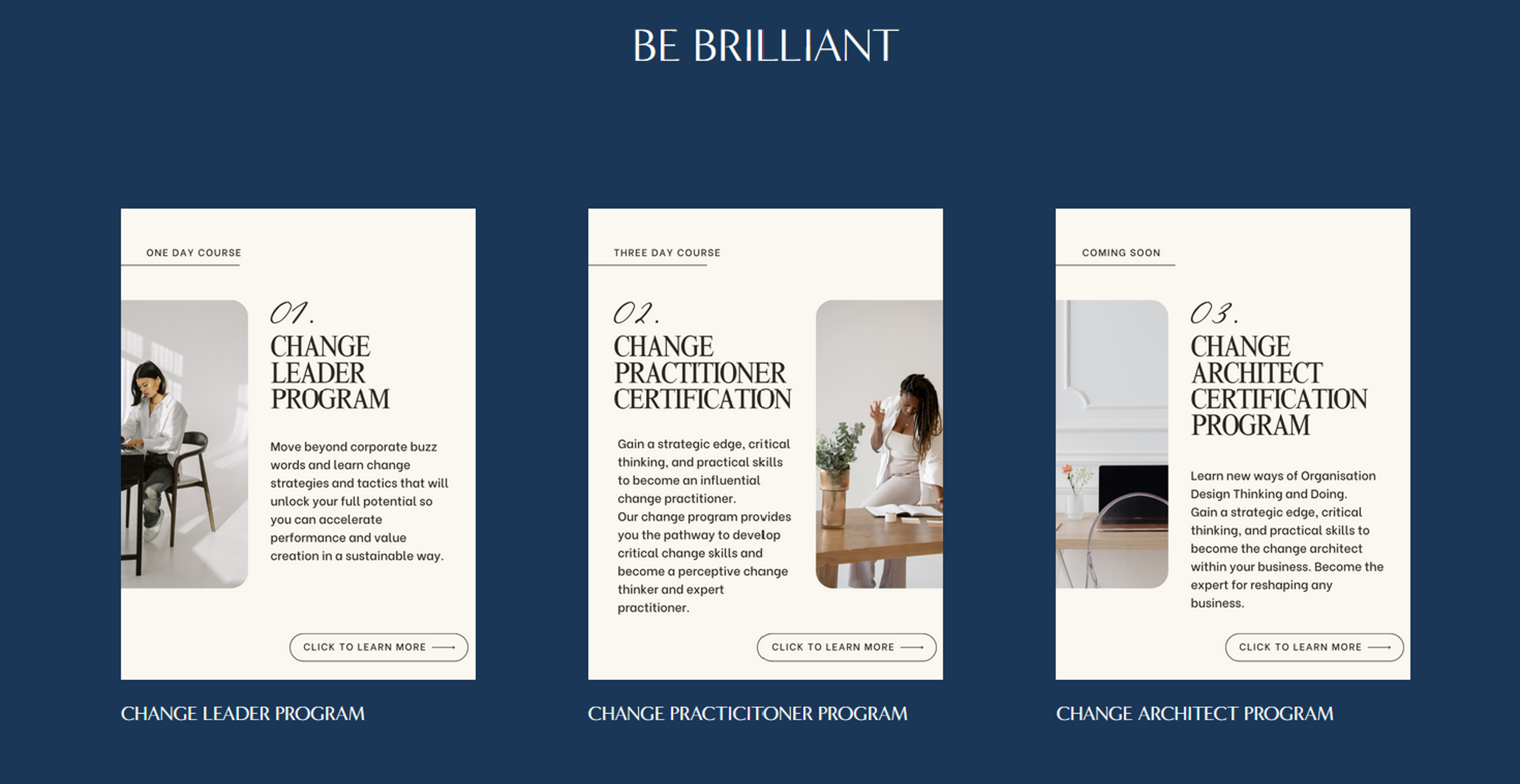 You will learn how to ‘THINK’ and ‘DO’ differently - We will teach and coach you in new thinking on how to design and architect your change. You will practice mobilisation and readiness tactics to increase your success.