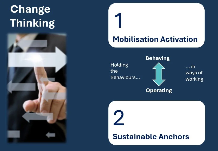It provides an effective way to navigate change by focusing on defining the critical behaviours (Thinking and Doing), that drive the lion's share of change results.